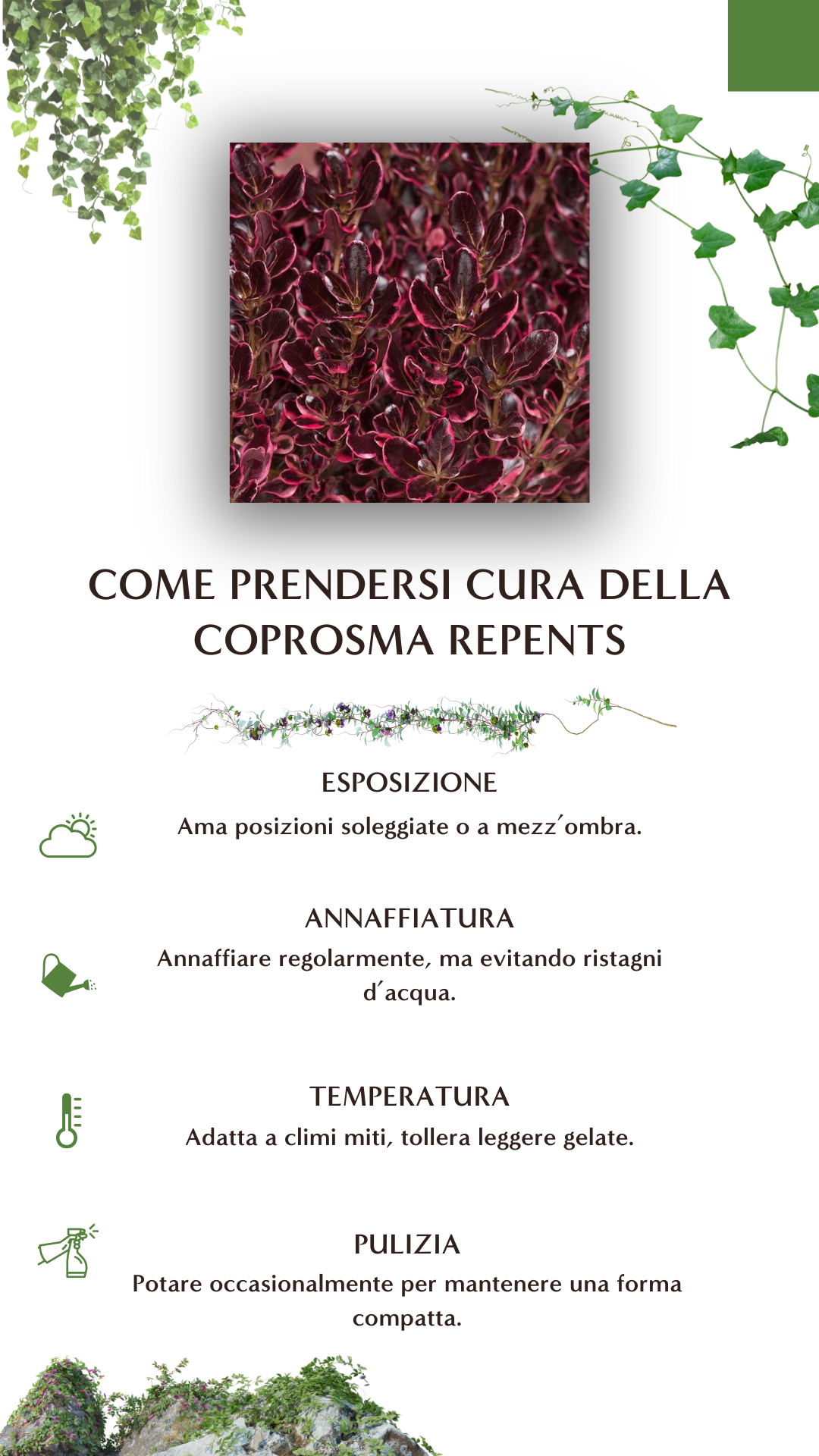 - Esteticamente decorativa: Con il suo fogliame lucido e le variegature colorate, la Coprosma repens è una pianta che porta un tocco di eleganza e colore al giardino durante tutto l'anno.