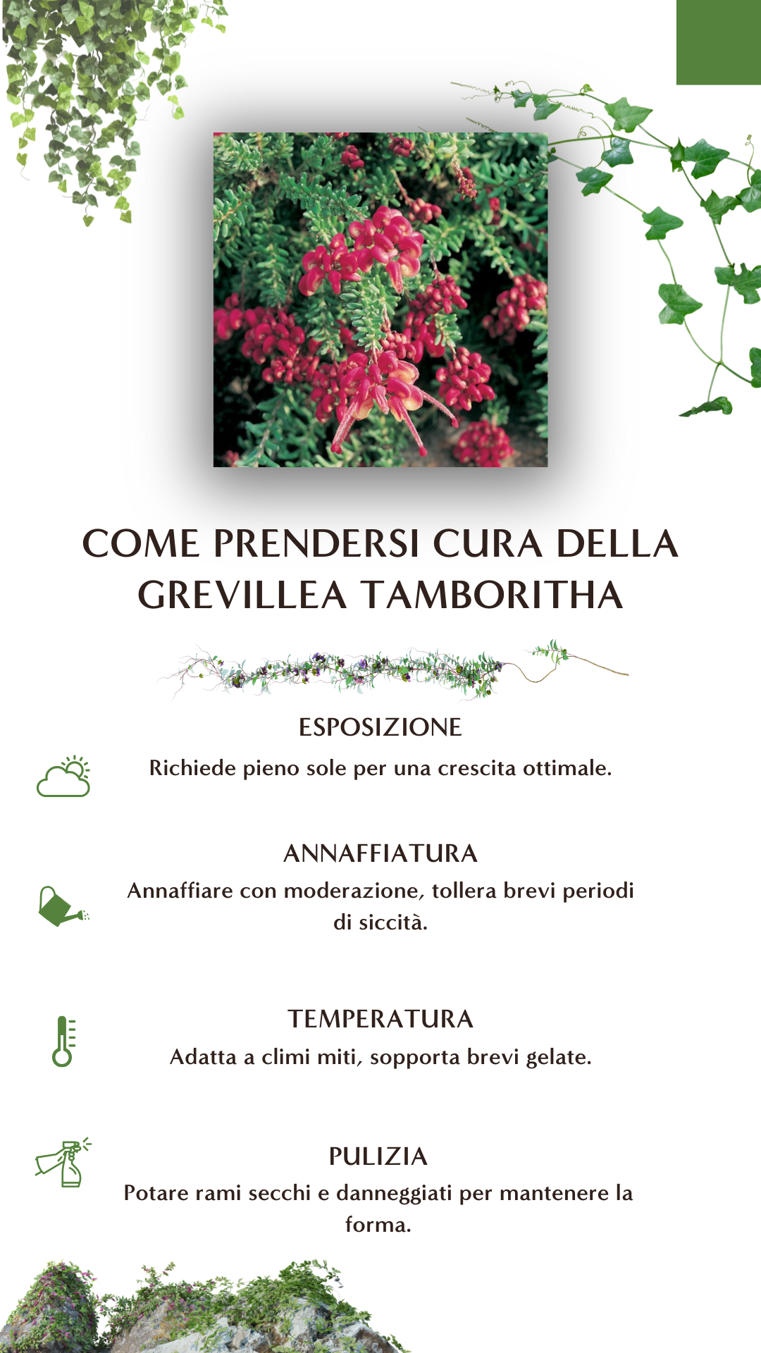 - Atrae gli impollinatori: I fiori della Grevillea tamboritha sono particolarmente apprezzati dagli impollinatori, come uccelli e api, che contribuiscono alla biodiversità del giardino.
