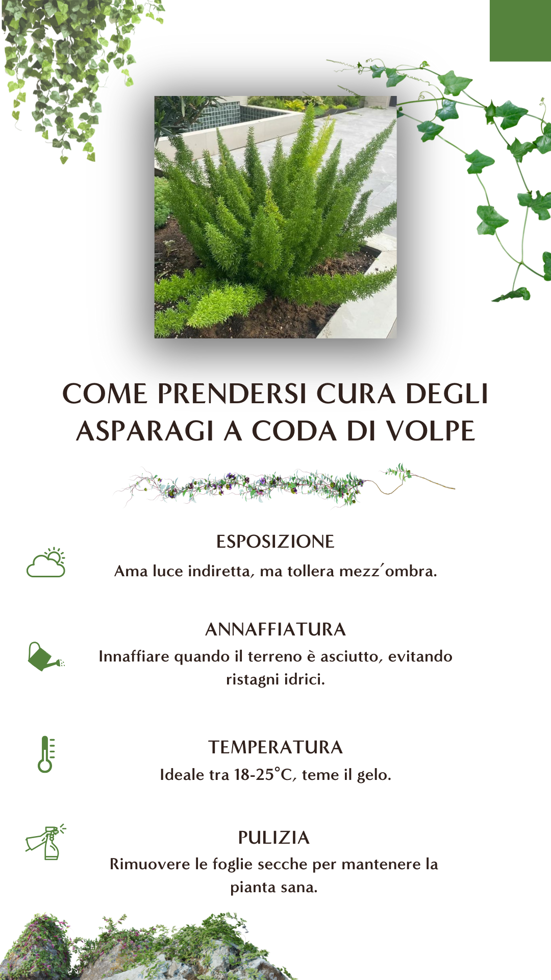 - Origine del nome: Il nome "Asparagus" deriva dal greco "aspharagos", che significa "germoglio" o "tenero", in riferimento alle giovani punte commestibili di altre specie di asparago. La varietà "a coda di volpe" è stata selezionata per la sua forma ornamentale e il suo fogliame delicato.